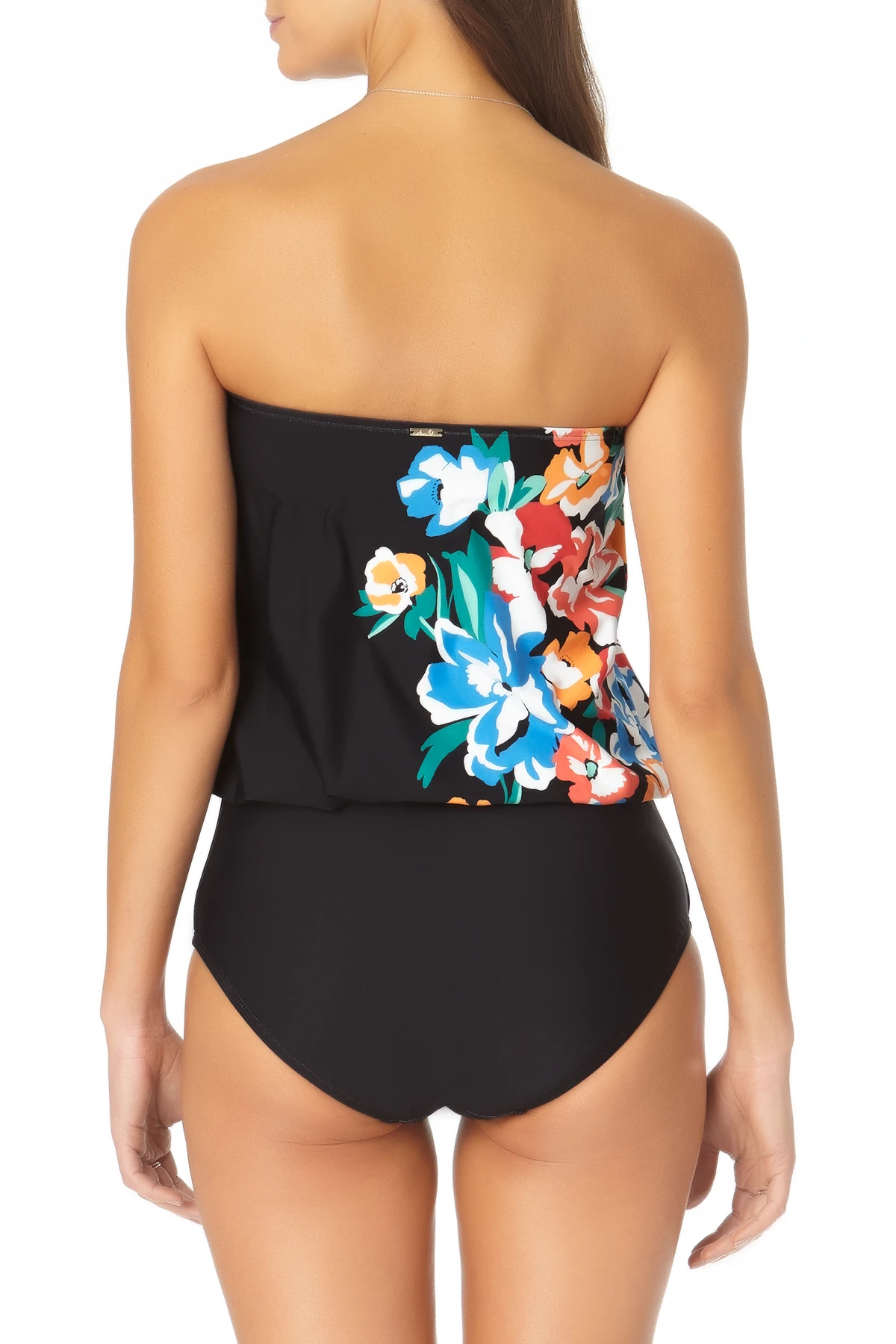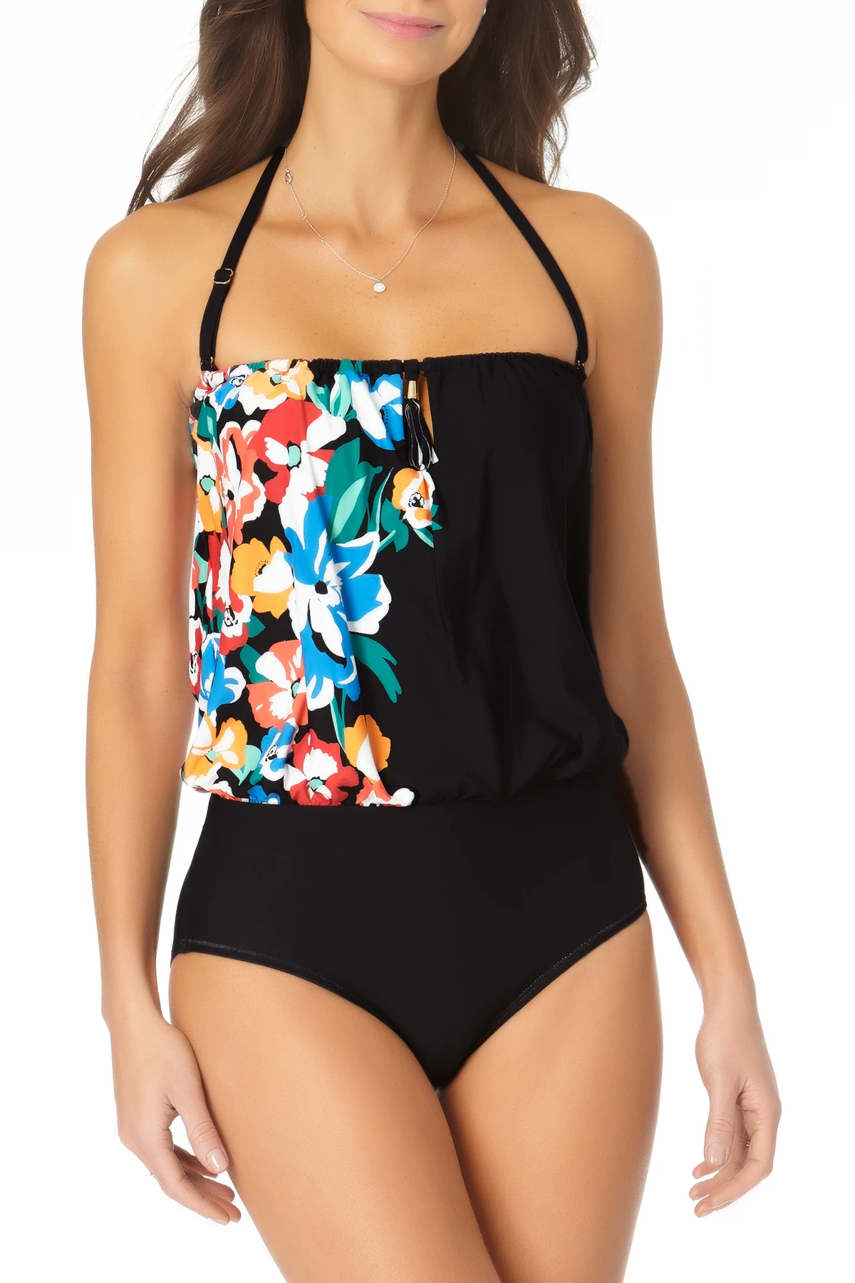 This little black swimsuit is a real head-turner. Our blouson one piece swimsuit is adorned with a beautiful floral bloom print to give you a touch of femininity for your day at the pool. This all-over blouson style swimsuit can be worn strapless with its removable strap, while its keyhole detail is an attractive and flattering touch. Wear this blouson one piece swimsuit with an Anne Cole cover up and your favorite sunglasses!