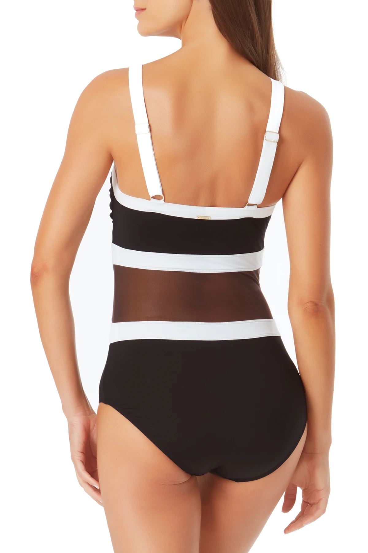 This sophisticated mesh one piece is designed to show off your silhouette without revealing too many secrets. The high neck cross cut is an elegant way to flatter your frame and shoulders. Breathable mesh makes for a comfortable and sleek fit, while bold asymmetric lines showcase the waistline. The swimsuit’s adjustable straps will give you a perfect fit with secure support for all your beach day activities. Pair this black mesh one piece with shades and a great tan for a chic beach look!