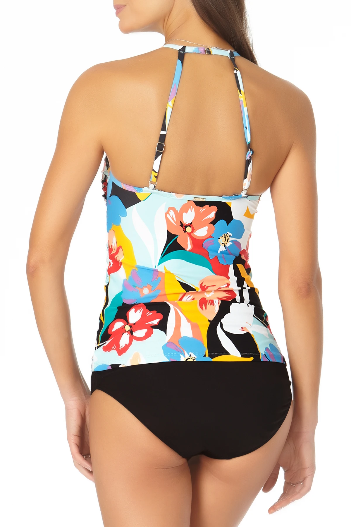 This colorful mesh, tropical-themed top will make you feel like you’re on an island getaway. The top’s mesh detail is an alluring and elegant detail that adds a twist to the tankini’s colorful style. A high neck cut will flatter your arms and shoulders, while shirred sides will flatter your figure and waistline. Mix and match this mesh high neck tankini top with a side tie bikini bottom for an unforgettable summer look!