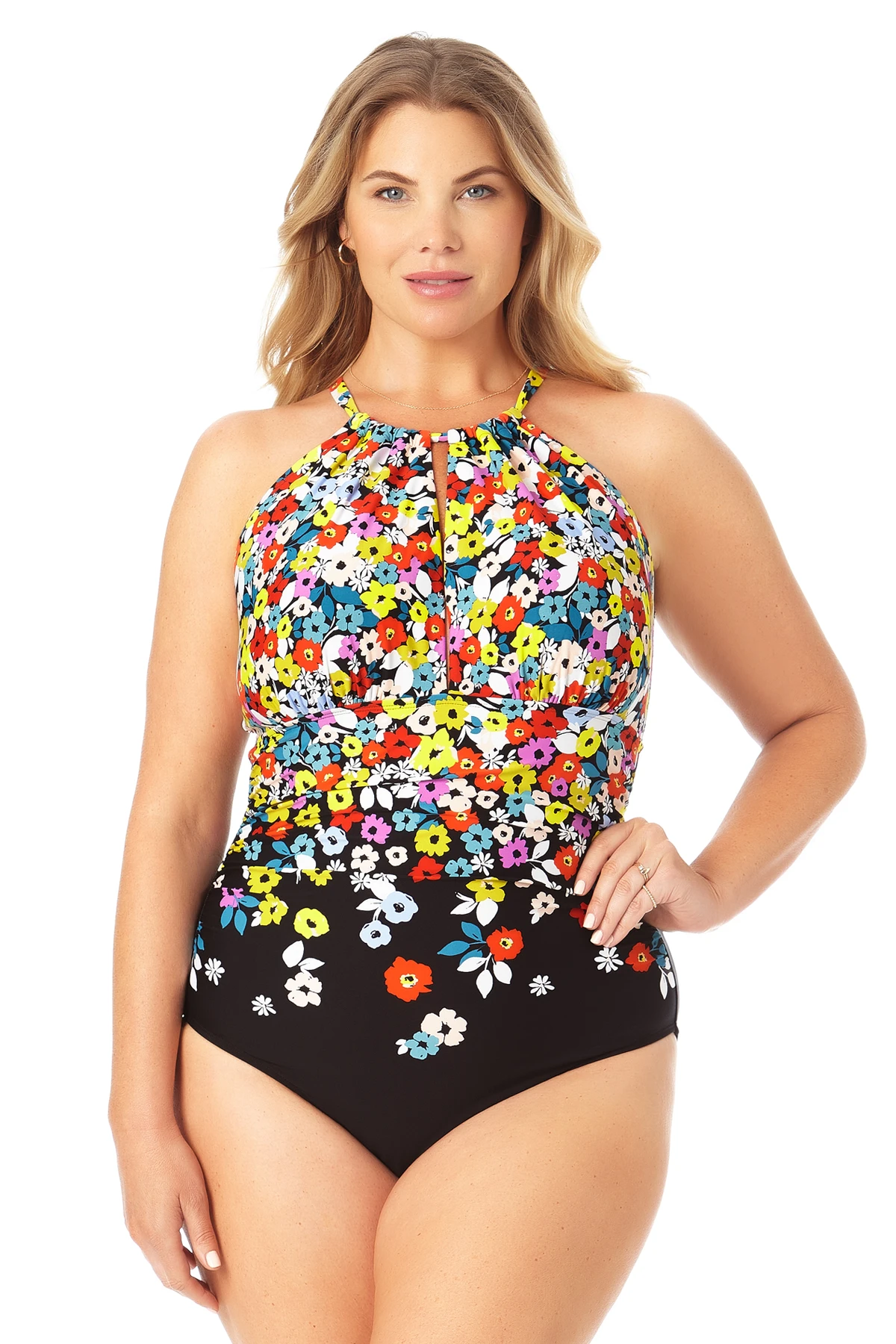 Make a splash at the beach with this eye-catching High Neck Swimsuit with Ruffle Straps. This plus-size one piece features a beautiful high neck design and a bright floral print that will turn heads in every setting. Elegant ruffle straps and shirred sides ensure a figure-flattering fit for your curvy silhouette. You’ll be lounging in all-day comfort and style under the sun. Grab our Anne Cole Plus Flounce V Neck Tunic Cover Up and your favorite beach sandals for a complete beach day look.