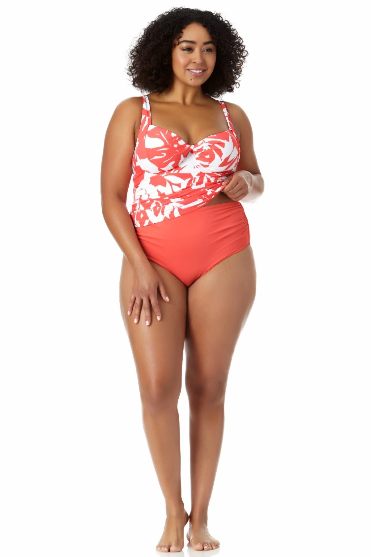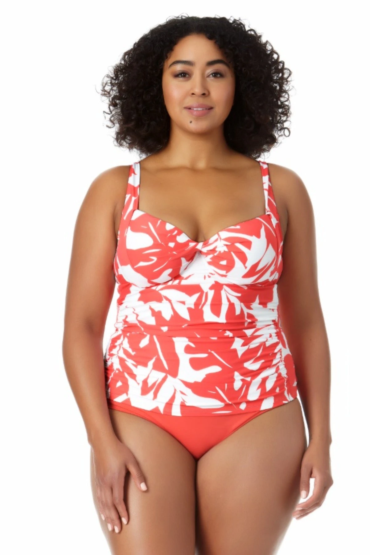 Look effortlessly stylish with our Retro Twist Front Underwire Tankini Swim Top. This trendy plus-size tankini top is designed to give you moderate coverage and ample support from its adjustable straps, removable cups, and underwire. Stand out from the crowd with the playful palm print, while the twisted front detail adds a touch of elegance to your look. Pair this retro underwire tankini top with a matching Anne Cole Plus swim skirt for a head-turning beach look!