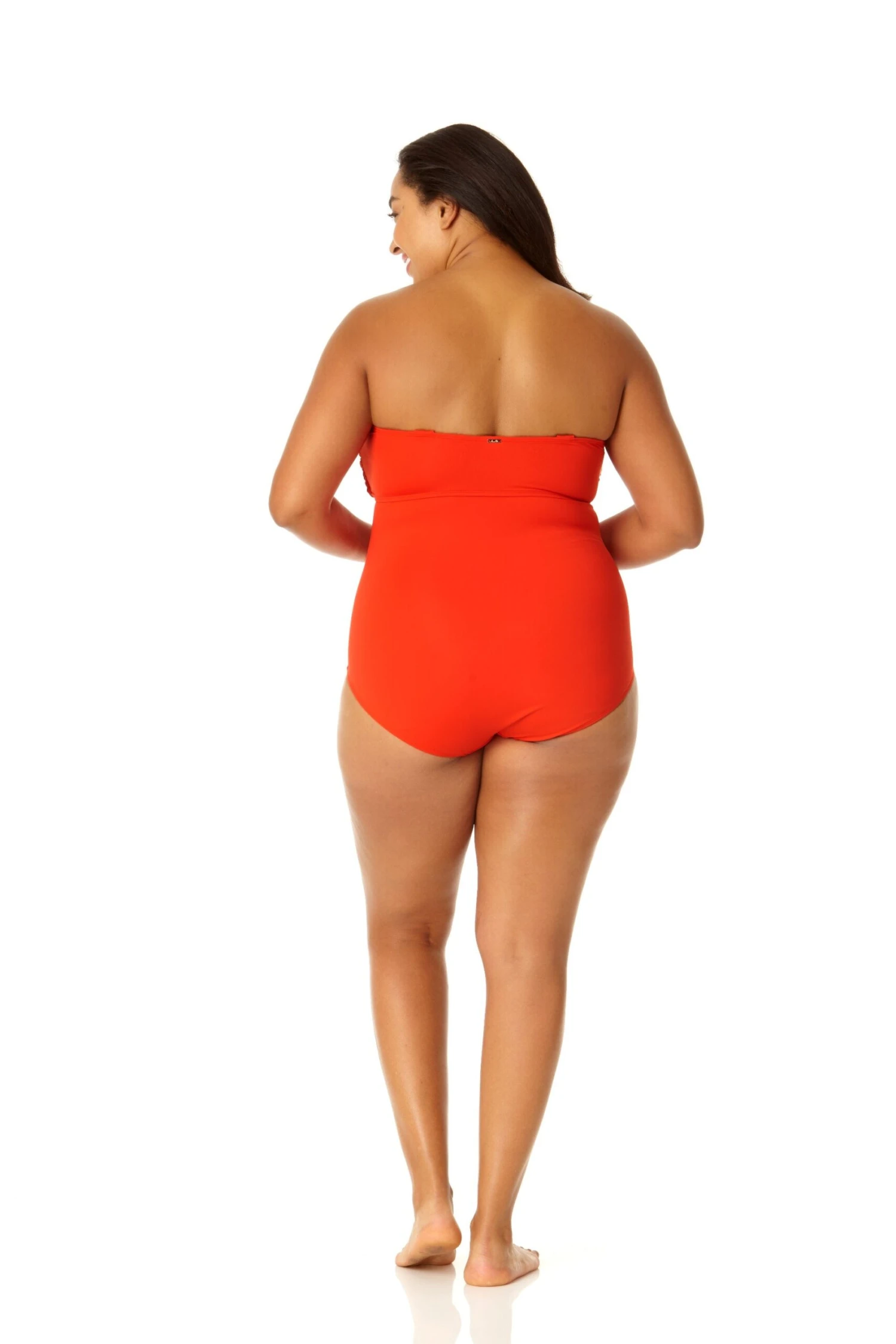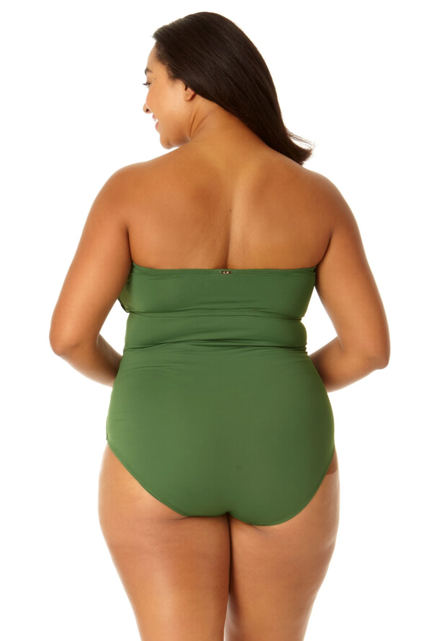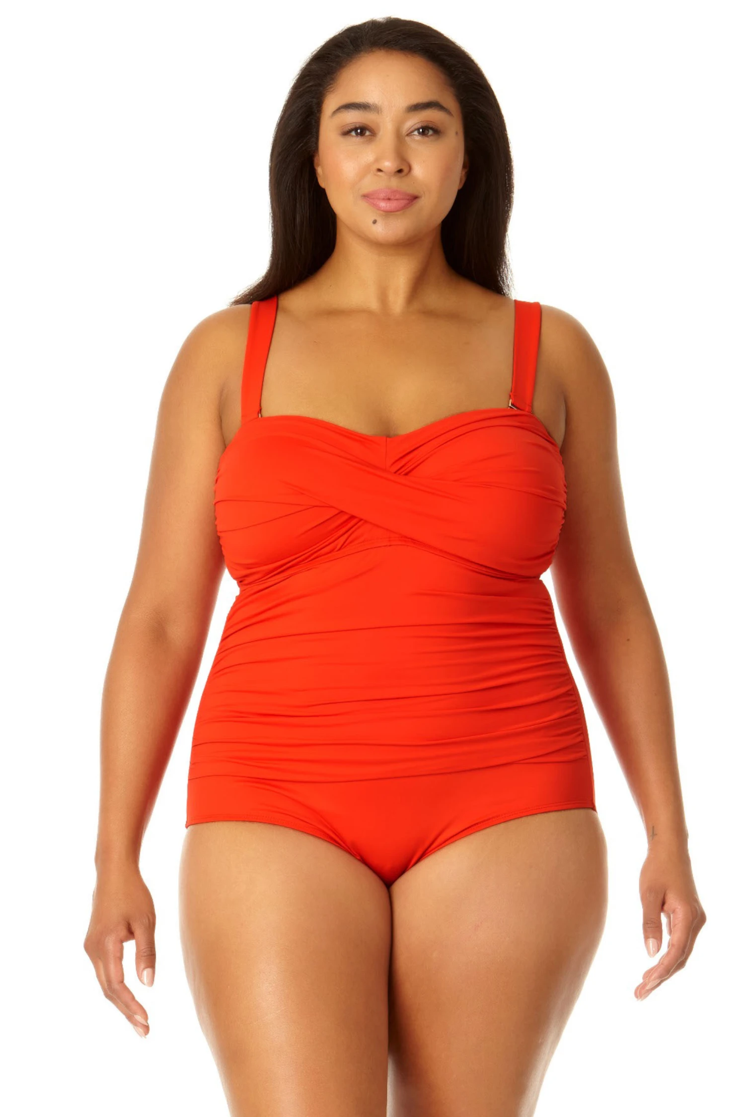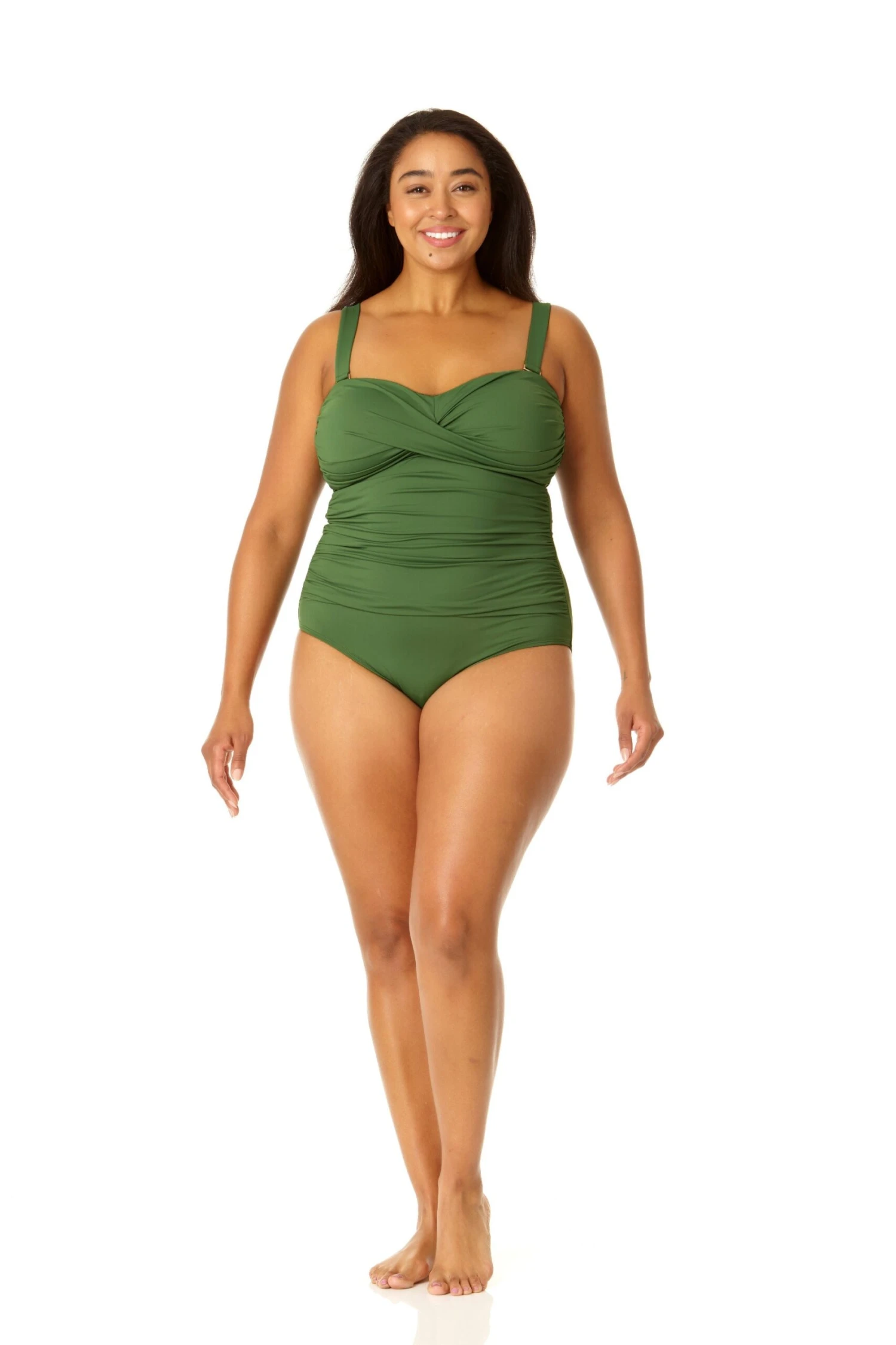 Whether you prefer to swim in the ocean or at a pool, you’ll love our twist front shirred one piece swimsuit This one piece swimsuit features adjustable and removable over-the-shoulder straps to ensure a perfect fit while giving you different ways to style your look. Shirred details and a twist front on this bandeau-style cut give you a figure-flattering look. Pair this twist front shirred one piece with our cover up for casual beach style.