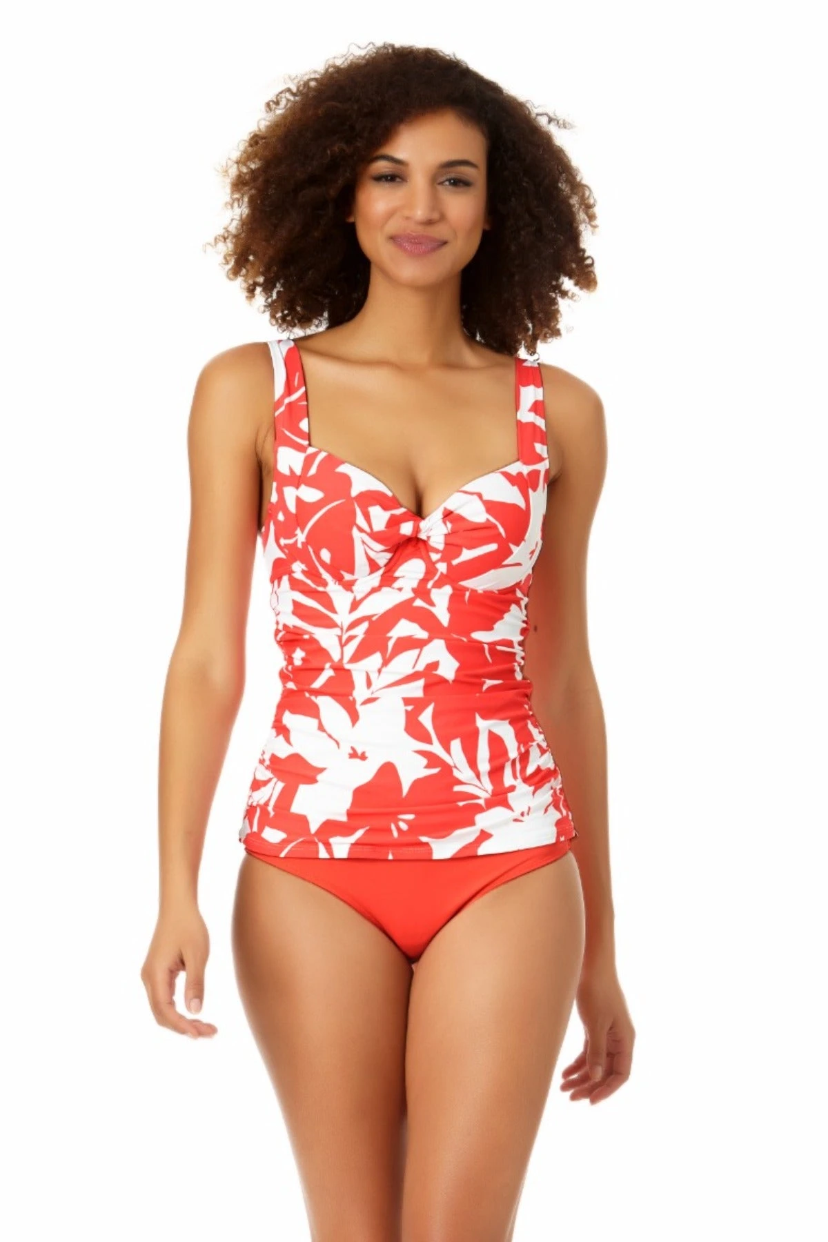 Our Retro Twist Front Underwire Tankini Swim Top is your perfect companion on your next tropical vacation. This bright floral tankini features a twist front detail to give you a chic look while the supportive underwire, adjustable back straps, and removable cups offer a comfortable and secure fit for all your water and sand activities. For a fun, breezy beach day look, pair this top with any Anne Cole swim skirt, and you’ll stand out wherever you go.