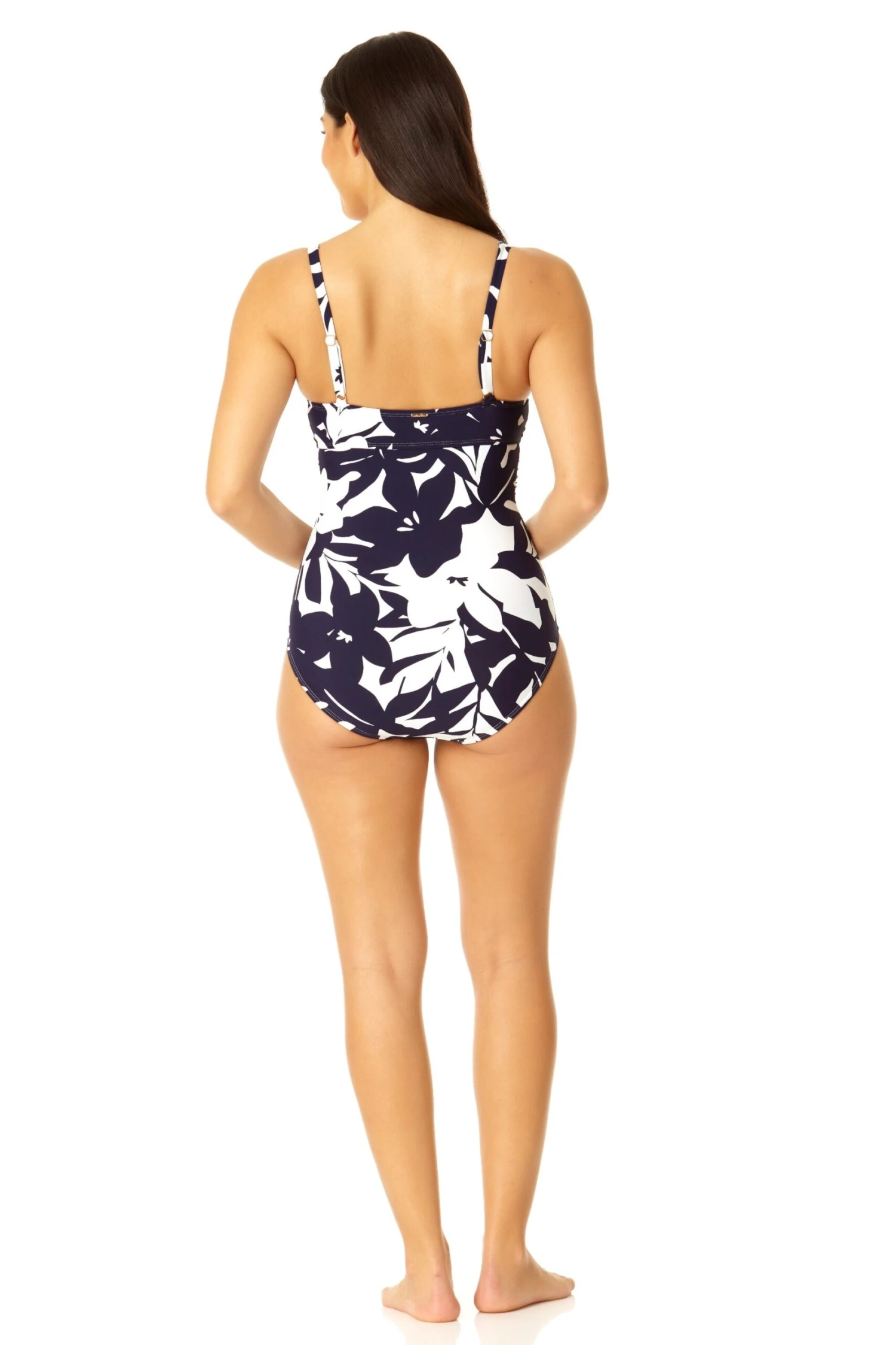 Our Retro Twist Front Shirred One Piece Swimsuit is part of the Coastal Palm collection, which features a navy and white tropical pattern. This one piece swimsuit has a twist front detail, shirring, and removable cups to add comfort and style to your summer look. Pair this one piece swimsuit with any Anne Cole Cover Up for a breezy beach day look!